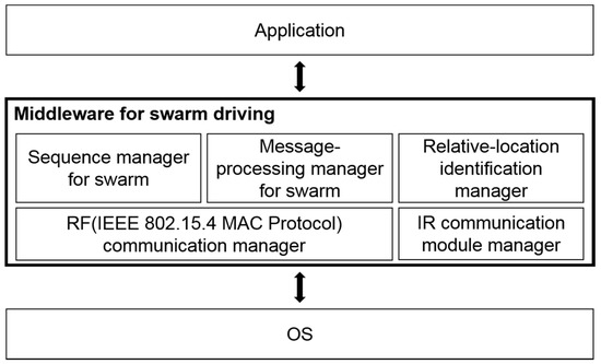 Figure 5 shows the middleware architecture for swarm-driving. The lower part of the middleware is composed of an RF communication manager and an IR communication module manager managing module’s modes in accordance with the state of the swarm-process. Above them are the sequence manager that manages organizing, maintaining, and dispersing the swarm, the message-processing manager that manages the message exchange of the overall swarm process, and the relative-location recognition manager that helps maintain the formation. The sequence manager progresses overall process according to messages from other robots in the swarm. Then, the sequence manager at specific stage of process configure other managers in the middleware to accomplish the goal of that stage.