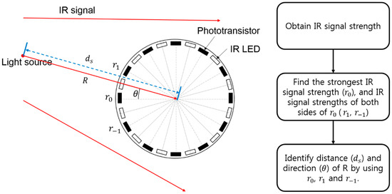 Equations (1)–(3) are for the IR signal-strength base relative-location identification; they were modified from [13]. Equation (1) shows the relationship between the measured signal strength and the actual signal strength (R) from a light source; Equations (2) and (3) were developed based on this equation. is the strongest signal strength among the measured signal strengths; and are the signal strengths on each side of the phototransistor that measured . When the measured strengths are applied to Equation (2), it estimates the x component as a, and the y component as b of the location vector from a light source to the module. With Equation (3), we estimate the distance using the estimated signal strength (r) and the direction (). If the number of the phototransistor that measured is not 0, we estimate the direction (ϕ) by adding an additional angle to θ.