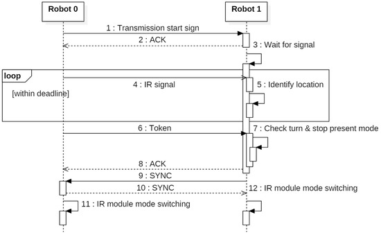 Figure 7 shows the sequence of the sequential IR signal transmission using a token. The robot with the token sends the transmission-start sign and waits for response messages. After receiving response messages from the other robots, the robot with the token transmits the IR signal until the deadline. When the deadline is reached, the robot with the token broadcasts the token message, including the number of the robot with the next turn, and waits for the response messages. After receiving the response messages, the robot with the token waits for sync messages from the other robots. After the sync-message switching, the robot with the number within the token message switches its IR module to transmission mode, and the other robots switch their IR modules to reception mode. This process is iterated until the end of the swarm-driving. Through this token method, we can guarantee time-synchronized sequential IR communication.