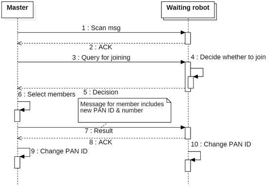 Figure 8 shows the sequence diagram of the process for organizing a swarm network. A master broadcasts a scan message to search for waiting robots and estimates the number of joining-candidate robots based on the responses to the scan message. Then the master broadcasts the joining query to the joining-candidate robots. Waiting robots that receive the joining-query decide their joining intention through the criteria, and send that decision to the master. The master makes the joining-candidate list and selects the joining robots through the criteria. It then sends the results of its decision. If the robots receive a non-participating notification, they enter the waiting state. If the robots receive a joining notification, the robots form an independent network by changing their PAN (Personal Area Network) ID to the new PAN ID included in the notification message. In addition, each robot can identify its neighbor robots by using the total number of swarm members and the number assigned to each robot in the notification message.