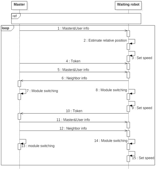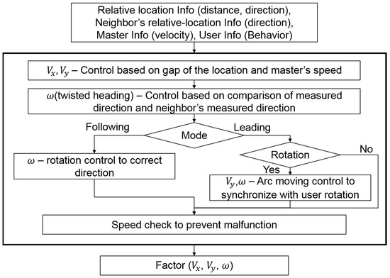 The slave-role main controller’s goal is to have a robot move to a predicted location to build a formation and maintain its distance and direction from the neighbor robots. To accomplish this goal, the slave-role controller uses the relative location, its neighbor robot’s relative location, the master’s driving speed, and the user activity, as shown in Figure 12.