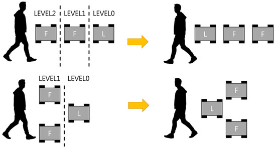 Moreover, the control method designates the master-role robot according to the driving mode and the shape of the formation, for a more natural swarm movement. In both leading and following modes, the user-connected robot is selected as the master. However, the difference between leading and following modes is the master’s location from the user. In following mode, the master is located closest to the user, but in leading mode the master is located farthest from the user, as shown in Figure 10. The master location in leading mode can make the master lead the other robots smoothly because it is less influenced by the location identification and the communication delay between the robots. Therefore, in leading mode, the formation building is started after the master is preferentially shifted, according to the hierarchical level shown in Figure 10. This hierarchical levels are assigned a lower number at the farthest robot in sequence. The master finds the need to move to the designated location, or figures out where to move, using this hierarchy.