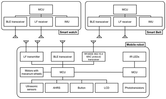 Figure 14 shows the overall hardware configuration of the swarm-driving Pet-Bot system. This system is composed of a mobile robot and two smart wearable devices. The smart wearable devices consist of an ARM Cortex-M3-based MCU (microcontroller) (1024 KB flash memory, 128 KB RAM), a BLE transceiver for exchanging information with a robot, an LF receiver to identify an authorized user and his/her location, and an IMU (Inertial Measurement Unit) to recognize user activity and gesture commands.