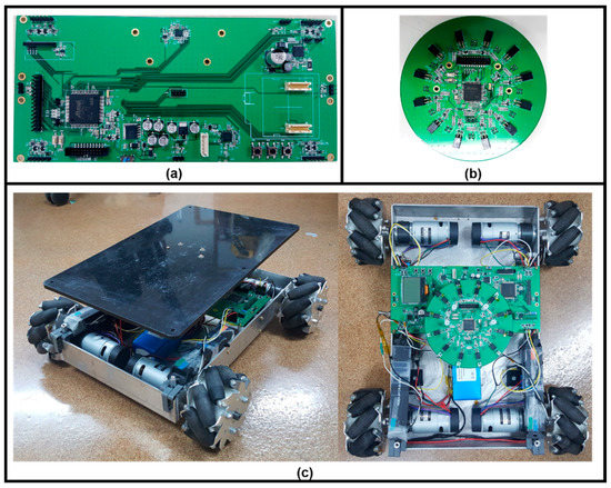 Physical prototypes: (a) main board; (b) IR communication module; and (c) mobile robot.