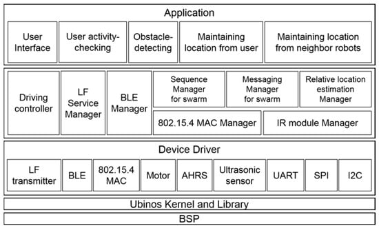 Figure 16 and Figure 17 show the main board’s software architecture and the IR communication module’s software architecture, respectively. Since both of them use the real-time Ubinos OS, the kernel and libraries for Ubinos are present in the board support package. Moreover, there are device drivers for peripherals to support Pet-Bot’s services. Middleware for managing the peripherals is located above the device drivers. The main board contains middleware for swarm-driving in this layer. Finally, applications for providing Pet-Bot’s overall services are located on the top layer of the software architecture.
