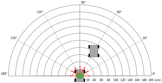 This evaluation is to verify the accuracy of the relative-location identification method using IR communication. We place the robot that transmits the IR signal in the center; the robot that receives the IR signal is located by changing the distance and angle, as shown in Figure 18. The distance varied from 20 cm to 40 cm in a range from 40 cm to 200 cm, and the angle varied from 0° to 180° in 30° increments. The receiving robot measured the IR signal 300 times at each point.