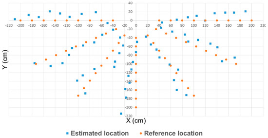 Table 4 shows the root mean square error (RMSE) values of the distance and direction. The results were a 7.898 cm RMSE and 6.52° RMSE. In this study, since each robot has to be located only within a certain range of the reference location, the result of the relative-location identification is considered sufficient for use as the input for the main controller.
