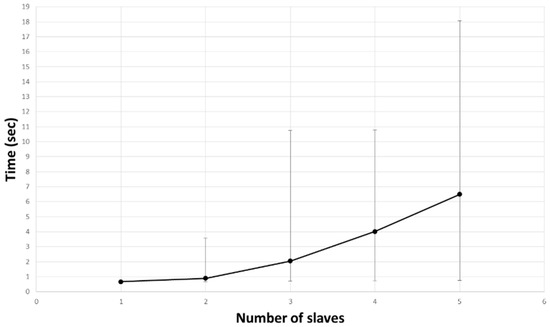 It can be seen that factors other than the number of slaves influence the maximum required time, since the maximum required time is the nearly same when the number of slaves is three and four.