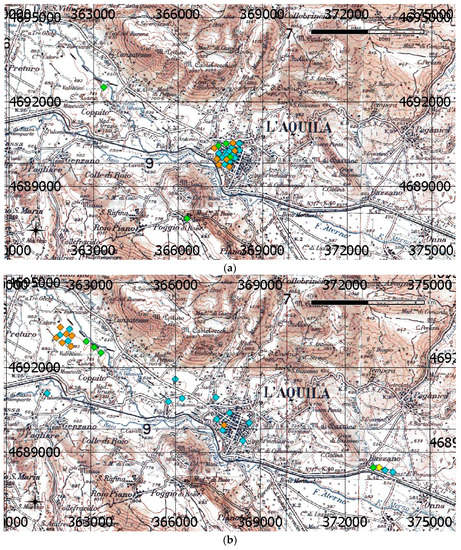 Satellite imagery was only used in the post-earthquake, L’Aquila City scenario, to detect damaged buildings for a quick damage assessment [,,] using the geometric and thematic capabilities of Very High Resolution (VHR) images. To the best of the authors’ knowledge, no use of satellite thermal images on this area, in order to monitor depopulation, is known. Before the main shock, the inhabitants of L’Aquila numbered around 16,000, about 10,000 inhabitants, plus the university student population, which was approximately 6000 residents []. Some decommissioned industrial areas were present, neighboring the city, along the valley that crosses the city from NW to SE. The inhabitants of the center were relocated to areas neighboring the old city by two projects: C.A.S.E. (Project for sustainable and earthquake safe houses: 13,000 inhabitants) and M.A.P. (project for temporary housing modules: 2800 inhabitants). After the event, development of the city following the morphology of the NW to SE valley took place; thus, new residential and business buildings were relocated along the NW to SE direction, the center of the city almost empty. This trend can be observed, for example, in Figure 2a,b [], where the public offices of national agencies (orange in Figure 2a,b), local agencies, such as prefecture and regional administration, courts (blue in Figure 2a,b), and university buildings (green in Figure 2a,b) are represented, before and after the event; the historic center is visible in the figures. A rigorous delineation of the urbanized area, after the event, is still not possible.