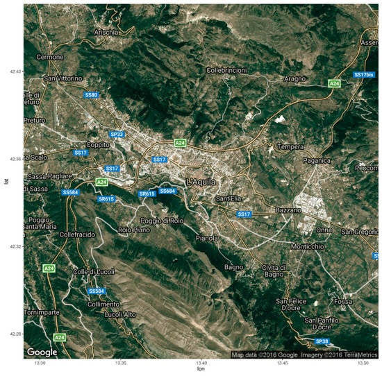 Study area of L’Aquila and its neighboring areas. Scenes copyrighted by Google Imagery, Mapdata, and Terrametrics. The image was reprojected from Spherical Mercator to WGS84; image is around 20 km in width.