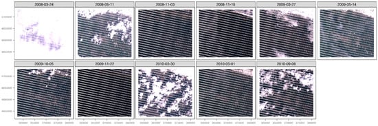 RGB composite of the four image-sets used for Land Surface Temperature estimation Scan Line corrector (SCL)-off mask applied, no cloud cover assessment); images are around 12 km in width.