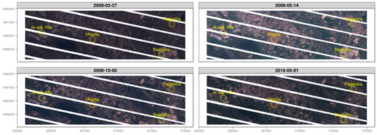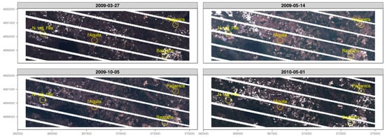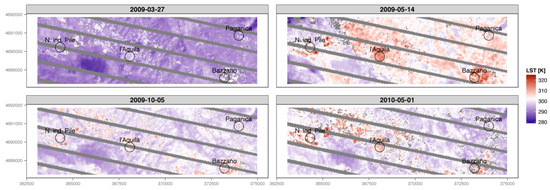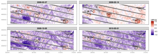 On the other hand, the destructive aftermath of the earthquake can be quickly identified by matching the first LSTr map with the other three, focusing on the towns of Paganica and Tempera (northeast of L’Aquila (Figure 9)): The urban structures of the two villages disappear from the LSTr time series. Indeed, it is well-known that Paganica and Tempera were severely hit by the disaster and remain uninhabited.