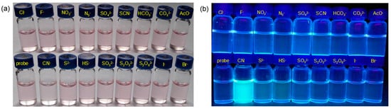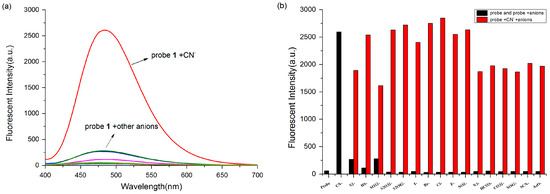 After the identification of the optimal fluorescence measurement conditions, a series of relevant and interfering anions were investigated to study the selectivity. Before the addition of various anions, the light-pink probe solution is non-fluorescent upon excited at 370 nm. The addition of 10 equivalents of 16 representative anions (S2−, HS−, SO32−, S2O32−, S2O82−, I−, Br−, Cl−, F−, NO2−, N3−, SO42−, SCN−, HCO3−, CO32− and AcO−) did not cause significant fluorescence changes (Figure 1a), whereas the color of the probe 1 solution faded in the presence of CN− (10 equiv.) and the fluorescence intensity enhancement at 480 nm was remarkable. Based on the good selectivity of probe 1 toward CN−, competition experiments were further explored. As shown in Figure 1b, the fluorescence intensity of probe + CN− remained at a high level by the addition of other interfering anions (10 equiv.), suggesting that the response of probe 1 toward CN− has good anti-interference ability.