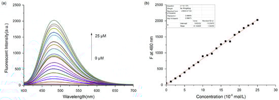 (a) Fluorescence spectra of probe 1 (5 μM) in the presence of various concentration of CN− (0–25 μM) in PBS/DMSO (4/6, pH = 7.4) solution; (b) Linear relation between the fluorescent intensity at 480 nm and the concentration of CN− in the range of 0–25 μM. λex = 370 nm, Slits: 2.5 nm/5 nm.