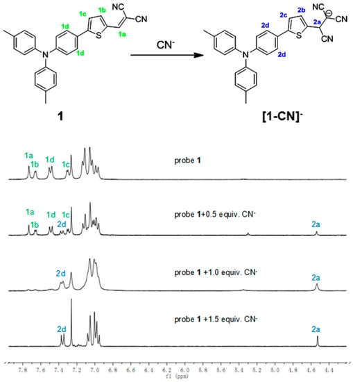 As proposed in the literature [51], the sensing mechanism of probe 1 based on a nucleophilic addition reaction has been confirmed by 1H-NMR spectroscopy (Figure 4). Thus, to a 20 mM solution of probe 1 in CDCl3 cyanide anion (0.5 equiv.) was added at room temperature and a new proton signal appeared at 4.5 ppm (H2a). When the amount of CN− was raised to 1.0 equiv., some significant proton signal changes were observed. For example, the vinyl proton signal (H1a, 7.73 ppm) disappeared gradually and a new proton signal at 4.5 ppm (H2a) was observed. The two proton signals on the thiophene ring (H1b, 7.66 ppm; H1c, 7.30 ppm) disappeared and were observed around 7.00 ppm. In addition, the two proton signals (H1d) adjacent to the thiophene ring shifted from 7.49 ppm to 7.36 ppm. These important proton signal changes conformed with the reference. While 1.5 equiv. CN− was added, the reaction accomplished completely. In addition, the [1 − CN]− adduct was characterized by mass spectrometry analysis, and the peak at m/z 457.1471 (calc. 457.1492) corresponding to [1 − CN]− was clearly observed (Figure S10).