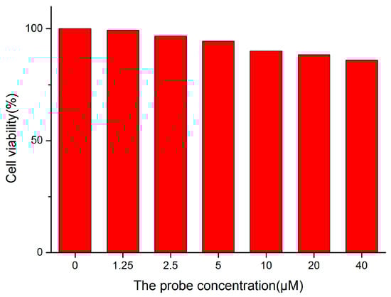 To explore its potential in bio-imaging, the cytotoxicity of probe 1 was investigated by a standard MTT assay. As shown in Figure 5, HeLa cell viability was slightly reduced when the probe concentration was raised up to 40 µM, indicating acceptable cytotoxicity of probe 1.