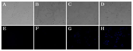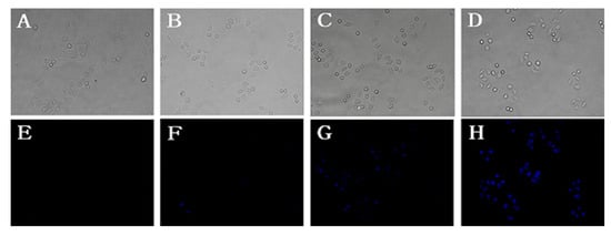 Probe 1 was next applied to detect cyanide anion in living HeLa cells. As shown in Figure 6, HeLa cells were incubated with probe 1 (10 µM) for 1 h and then with different concentrations of CN− (A, E: 0 µM; B, F: 10 µM; C, G: 80 µM; D, H: 160 µM) for 15 min. Under the fluorescent microscope, remarkable intracellular blue fluorescence was observed (Figure 6G–H). Moreover, the fluorescence intensity showed a concentration-dependent manner. As shown in Figure 7, HeLa cells were incubated with different concentrations of probe (0 µM; 2.5 µM; 5.0 µM; 10 µM) for 1 h and then with CN− (80 µM) for 15 min. The fluorescence intensity also showed a concentration-dependent manner. In summary, probe 1 showed the potential to detect CN− in vitro cellular systems in a concentration-dependent manner for both probe and CN−.