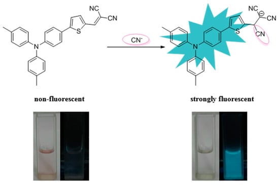 Anions play an important role in a wide range of chemical and biological processes. Given this, anion recognition has been well studied in recent years [1]. Among various anions, cyanide anion (CN−) is a well-known anion that is toxic to living organisms [2]. As advocated by the World Health Organization (WHO), the maximum concentration of cyanide anion in drinking water should be 1.9 µM [3]. However, CN− is widely released from industry waste, certain natural plants, cigarette smoke, etc. [4], and can thus be a serious threat to people’s health and the environment. Hence, developing effective quantitative determination methods for CN− is urgent and essential.