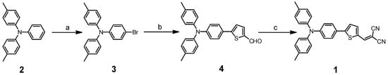 3.2.3 Synthesis of 2-((5-(4-(di-p-tolylamino)phenyl)thiophen-2-yl)methylene)malononitrile (1)