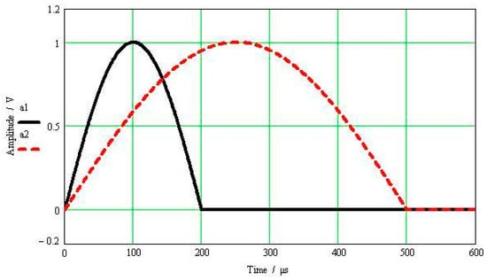 As indicated by Equation (2), when the pulse duration of the excitation acceleration is much larger than the undamped natural period of the accelerometer, namely , the first two terms of the equation can be ignored and, therefore, ; when the pulse duration of the excitation acceleration decreases and increases, the first two terms will be influenced. The first term will cause the oscillation of and the second term will lead to a time lag.