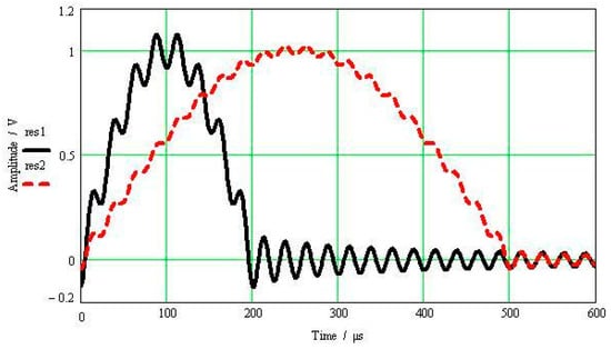 Figure 1 shows half-sine excitation signals with amplitude of 1 V and pulse widths being 500 μs and 200 μs, respectively. The resonant frequency of the calibrated accelerometer is 40 kHz, its resonance peak is 40 dB and its normalized amplitude-frequency characteristics are shown in Figure 2. Figure 3 shows the calibrated accelerometer’s frequency domain response to the two pulsed excitations, and Figure 4 demonstrates the calibrated accelerometer’s time domain response to the two pulse excitations gained by Fourier inversion.
