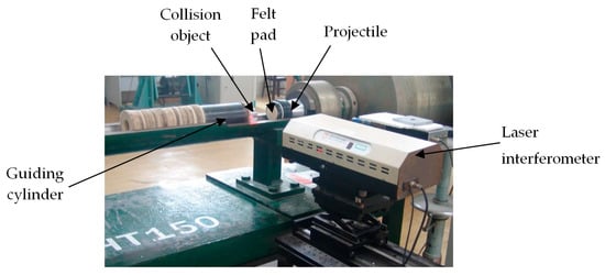 The calibration system in our lab is composed of an air gun, projectile, test component, and laser interferometer. The air gun is a one-stair air gun which is composed of a high pressure chamber with a volume of 0.036 m3, valve, silencer, liquid gas buffer device, launching canal with 6.2 m length, and 100 mm caliber. The collision surface of the projectile which can be filled with soft materials, such as felt, is made from steel, and other parts are made from aluminum alloy. The test component is composed of a collision object, calibrated accelerometer, and guiding cylinder. A diffraction grating is glued on the surface of the collision object.