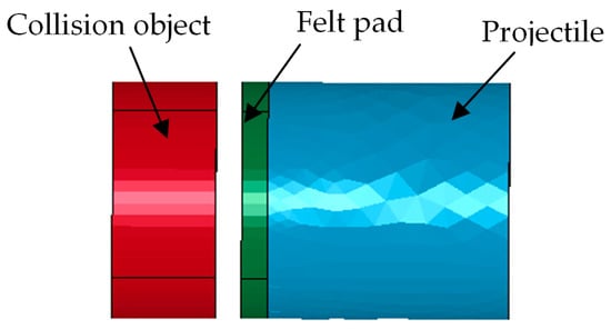 To obtain the excitation pulse width required by the accelerometer and reduce the number of required debugging tests, the dynamic process of the collision is simulated using ANSYS-LS-DYNA software (ANSYS Corporation, Canonsburg, PA, USA). Figure 7 shows the finite element model. A 3-D solid 164 unit is used, the impact velocity of the projectile is set as 50 m/s, and the terminal time is set as 1500 μs. The 3-D Lagrange rule is used to simulate the collision process by changing the mass of the collision object, the contact area, and the thickness of the felt pad.