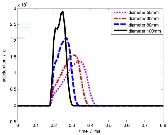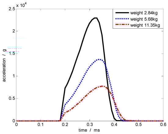 When the material of the collision object is certain, the kinetic energy lost during the collision is related to the mass ratio of the two objects. The kinetic energy lost is transformed into internal energy because of the permanent deformation generated on the objects. Therefore, when the mass of the gas gun projectile is constant (2.72 kg), the kinetic energy lost during the collision could be decreased by reducing the mass of the collision object. As indicated by Table 2, decreasing of the mass of the collision object has a relatively small impact on the pulse width, but has great influence on the acceleration amplitude. The corresponding acceleration curve is shown in Figure 8. Furthermore, when the projectile velocity remain constant, a high acceleration amplitude is obtained by reducing the mass of the collision object.
