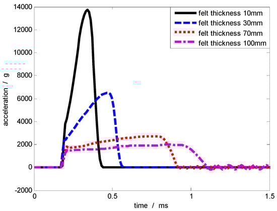 With the diameter of the contact surface fixed at 50 mm, when the mass of the collision object remains constant (5.68 kg) and the projectile velocity is constant (50 m/s), the collision simulation is conducted by changing the thickness of the felt pad. Table 4 demonstrates the changes in the acceleration pulse when the thickness of the felt pad is within the range of 10–100 mm. As shown in Figure 10, as the thickness of the felt pad increases, the amplitude of the acceleration pulse declines, and the rising edge become slower, while the pulse width grew larger.