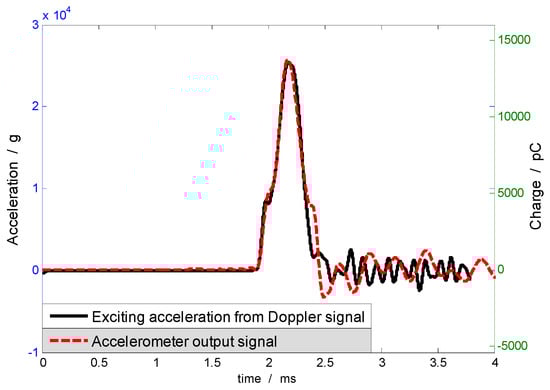 Figure 11 shows the Doppler signal by the laser interferometer and presents the test curve of the eighth calibration test in Table 5. The acceleration signal gained by Doppler signals output (Figure 11), namely, the excitation signal of the calibrated sensor, is shown by the solid line in Figure 12, and the peak acceleration 25,410 g. Meanwhile, the dotted line in Figure 12 demonstrates the signal output by the calibrated sensor, where the peak value 13,213 pC. According to Equation (13), the ratio of the peak values of these two signals is equal to the impact sensitivity in the table. The wide pulse calibration method avoids the filtering process of the response signal and improves the accuracy of peak sensitivity calibration.