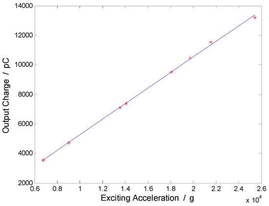 The calibration data in Table 5 are fitted by the least squares method, and the fitting curve is shown in Figure 13. If the fitting formula of the peak sensitivity is , then the response error of the calibrated accelerometer is shown in Table 5.