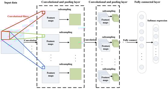 The convolutional layer is composed of a number of two-dimensional (2D) filters with weighted parameters. These filters convolute with input data and obtain an output, named as feature maps. Each filter shares the same weighted parameters for all the patches of the input data to reduce the training time and complication of the model, which is different from a traditional neural network with different weighted parameters for different patches of the input data. Suppose the input of the convolutional layer is , which belongs to , and A and B are the dimensions of the input data. Then the output of the convolutional layer can be calculated as follows []: