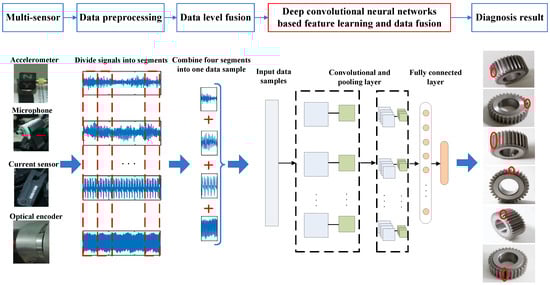 Figure 2 displays the flowchart of the proposed method: (1) four types of signals, including vibration signal [,,], acoustic signal [,], current signal [,,], and instantaneous angular speed (IAS) signal [,], are selected according to published studies and acquired from a planetary gearbox; (2) data preprocessing is applied to standardize each signal and divide them into segments; (3) each of the four segments of the four signal types are combined together simply as one data sample to form the data-level fused input data of the DCNN model; (4) DCNN is trained and tested with these fused input data, and its output will be the diagnosis result of the planetary gearbox. The testing accuracy of the output result is used to evaluate the effectiveness of the proposed method. It should be noted that although we use a data-level fusion in the third step, data is fused again in the starting layers of the DCNN model to further optimize the data structure. The DCNN implicitly contains data-level fusion, feature-level fusion, and decision-level fusion through the deep-layered structure and it optimizes a combination of these fusion levels adaptively according to the characteristic of the data itself.