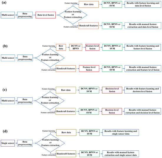 Flowcharts of comparative methods: (a) Data-level fusion methods; (b) Feature-level fusion methods; (c) Decision-level fusion methods; and (d) Methods with single sensory data.