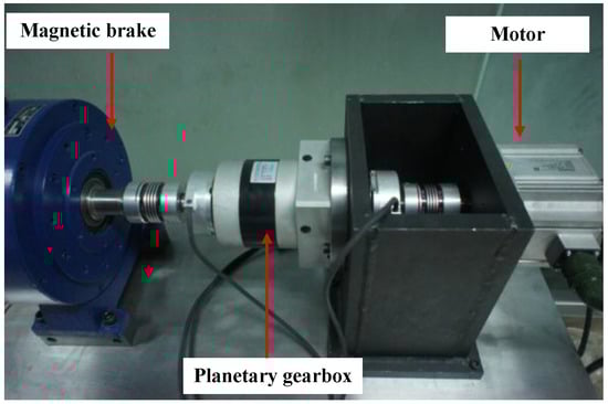 An experimental system of a planetary gearbox test rig is established to evaluate the effectiveness of the proposed method. As shown in Figure 4, it consists of a one-stage planetary gearbox, a driven motor and a magnetic brake. The planetary gearbox contains one 20-tooth sun gear and three 31-tooth planetary gears, and transmits torque from the sun gear to the planetary carrier of the planetary gears with a standstill ring gear.