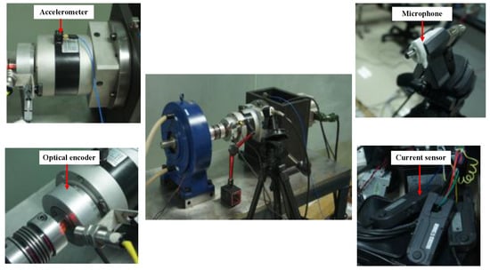 Figure 5 presents the four types of sensors employed in the experiment, including an accelerometer, microphone, current sensor, and optical encoder. Vibration signal, acoustic signal, and motor current signal are measured by their corresponding sensors and acquired through a data acquisition box with a sampling frequency of 20 kHz and data length of 320 k points. The IAS of the output shaft is calculated based on counting the number of high resolution pulses of the encoder []; and down-sampling, using the data acquisition box with the same sampling frequency and data length as the other three signals.