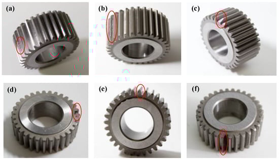 Faulty planetary gears: (a) Pitting tooth; (b) Chaffing tooth; (c) Chipped tooth; (d) Root crack tooth; (e) Slight worn tooth; and (f) Worn tooth.