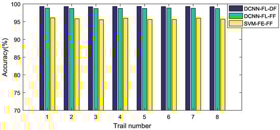 Following the flowcharts shown in Figure 3a–c in Section 3.3, methods with three fusion levels, three intelligent models, two feature extraction methods, and multi-sensory data are tested in the experiment. The results are displayed in Table 4, in which the result of the proposed method is marked in bold. Figure 7 presents the testing results of the eight trails of the top three methods, which are the proposed method, the DCNN model with feature learning and feature-level fusion, and the SVM model with handcraft features and feature-level fusion.