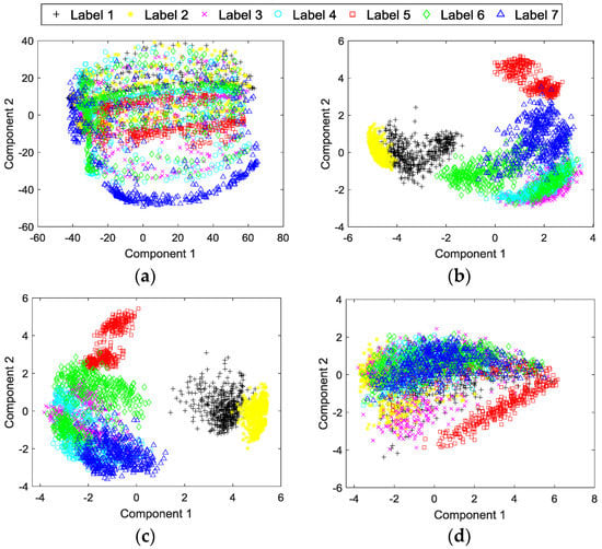 PCA is employed to analyze and visualize the learned features of the proposed method. As shown in Figure 9, the labels 1 to 7 correspond to the seven conditions of the planetary gearbox described in Table 1, and the first two principal components (PCs) are obtained by PCA to represent the useful information hidden in the data. Figure 9a shows the result of the input data of the testing dataset of the proposed method along the first two PCs. Figure 9b illustrates the result of the learned features with adaptive fusion levels of the proposed method for testing the dataset, which are extracted from the output of the second-last layer of the DCNN. For comparison, the results of feature-level fused features learned through DCNN and feature-level fused handcraft features along the first two PCs are shown in Figure 9c,d, respectively. It should be noted that we only display the first two PCs of the data for a clearer visualization, which means that there may be overlaps between some categories and many of them can be divided into higher PCs.