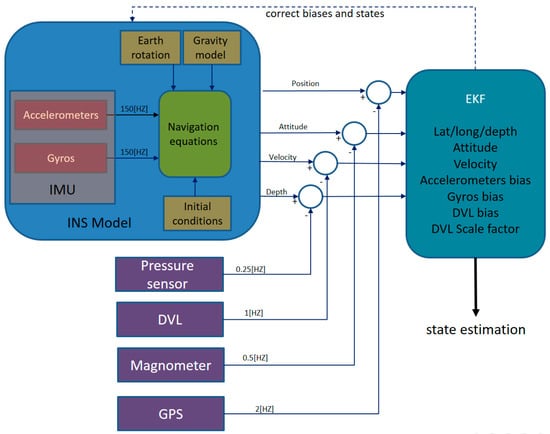 In Figure 3, a top-level block diagram of the TAUV navigation system is shown. The accelerometer and gyro measurements are integrated into the INS system in order to produce its standalone solution for position, velocity, and attitude. The extended Kalman filter (EKF) [,,] fuses the INS with measurements from the other sensors: the magnetometer, PS, DVL and GPS. By comparing the INS state calculation and aiding the sensor measurements, the EKF estimate corrects the error state vector comprising the INS states and inertial sensor error terms. Notice that each aiding sensor operates at a different sampling rate, yet in each time instance that a measurement arrives, it is fused with the INS.