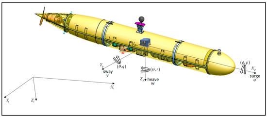 The navigation equations and the EKF are expressed in a coordinate frame, known as the platform frame. The platform frame is located at the center of buoyancy of the vehicle. The navigation frame is determined by the INS frame. For simplicity of the dynamics equations, we assume that the platform frame and the INS frame are located at the same point at the AUV and with identical orientation. The TAUV platform frame and the tangent frame are represented in Figure 4. The vehicle velocities are expressed in the platform frame, and the vehicle attitudes expressed in the tangent frame by the roll, pitch, and yaw Euler angles.