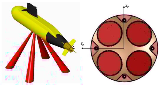 where represents the direction of each transducer/beam of the DVL expressed in the platform frame, for i = 1,2,3,4, is the pitch angle (relative to platform frame) of each DVL beam, and is the yaw angle (relative to platform frame) of each DVL beam for i = 1,2,3,4. In the TAUV DVL, is equal to 20°.