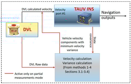 The DVL enables access to its raw data and its calculated velocity. In the case of partial measurements, the DVL cannot calculate the vehicle velocity, and only the partial raw data is available. From the raw data, we can calculate the vehicle velocity and the variance from all four approaches as presented in the previous sections. Instead of choosing which approach to use in the TAUV, in Equation (48) we employ a simple selector to pick the best vehicle velocity components out of the four approaches and use each derived corresponding velocity to aid the INS.