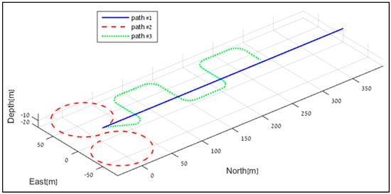 In this section, we evaluate the ELC approach under three commonly used trajectories of the TAUV and other AUVs. The objective of using several trajectories is to evaluate the navigation performance of each method under different dynamic conditions. Figure 8 shows the chosen trajectories for the analysis. The first trajectory is a straight-line trajectory along the north direction while the AUV travels with constant speed and depth. This trajectory is chosen since in steady state the TAUV will, theoretically, travel in straight lines. The second trajectory follows a figure eight pattern. This trajectory contains permanent maneuvers and also a dive with constant velocity. The third trajectory is a classic seeking trajectory (lawn mower pattern) used for bottom survey. This trajectory begins with a dive at constant rate, and then in the searching phase constant depth is kept.