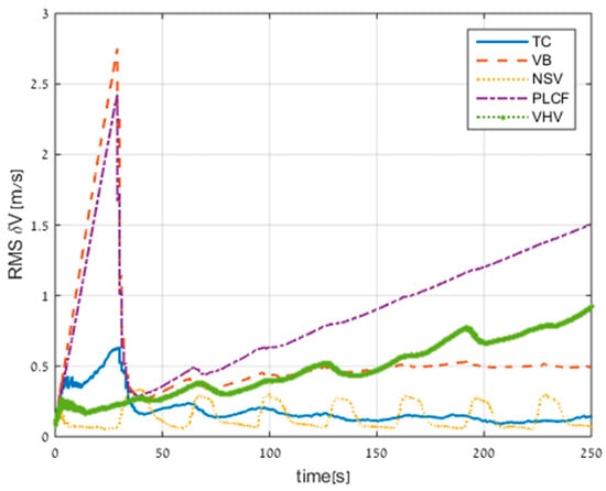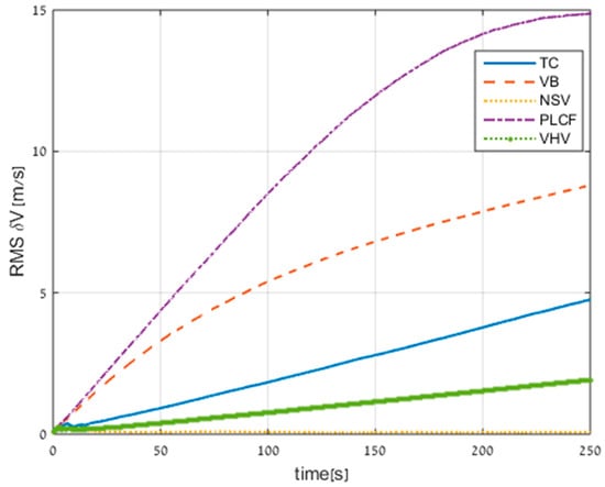 Figure 13 presents the velocity RMS errors of all ELC approaches and the TC approach. The standalone INS velocity error in this trajectory is 36.5 m/s after 250 s. As seen in Figure 10, all the proposed approaches improved the standalone INS, and the VB approach reduced the RMS velocity error to 0.5 m/s. The NSV approach managed to obtain similar performance to that of the TC, although its velocity error oscillates due to the change in the maneuvering direction. In the first 30 s, the velocity errors of methods VB and PLCF drift rapidly in time. The reason for this behavior is that the vehicle performs diving in that time period. After the TAUV completes the diving and reaches its desired depth, the velocity error of the VB approach does not drift in time.