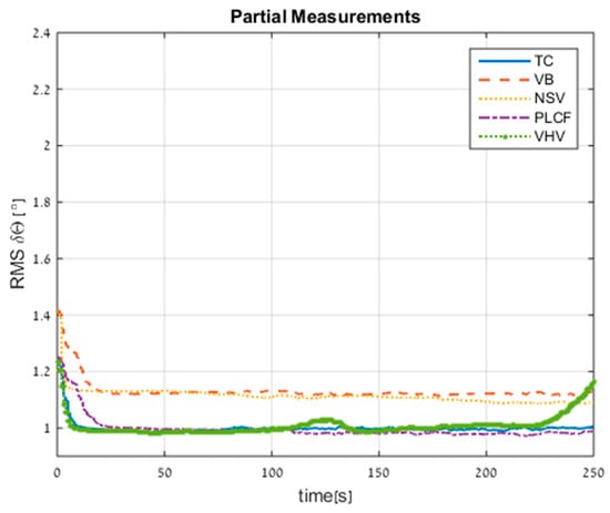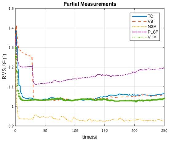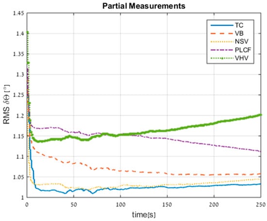 Figure 14 shows the RMS errors of the attitude. The standalone INS performance is 1.29° after 250 s. All proposed approaches improved the standalone INS; in particular, the NSV achieved 38% improvement and even achieved an improvement of 12% relative to the TC approach.