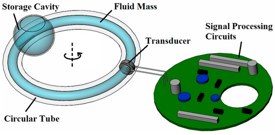Angular acceleration plays a significant role in vibration detection, rotation controlling and navigation [1,2]. To achieve reliable and accurate direct angular acceleration measurements, different physical principles and technologies have been used: including superconductivity [3], floated-fly-wheel [4], MEMS [5], heat transfer [6,7], electromagnetics [8] and fluidics [9,10,11,12,13,14,15,16,17,18]. The fluid-based design demonstrates an excellent balance in accuracy, bandwidth, measurement range, volume and insensitivity to linear acceleration [9,10,11,12,13,14,15,16,17,18].