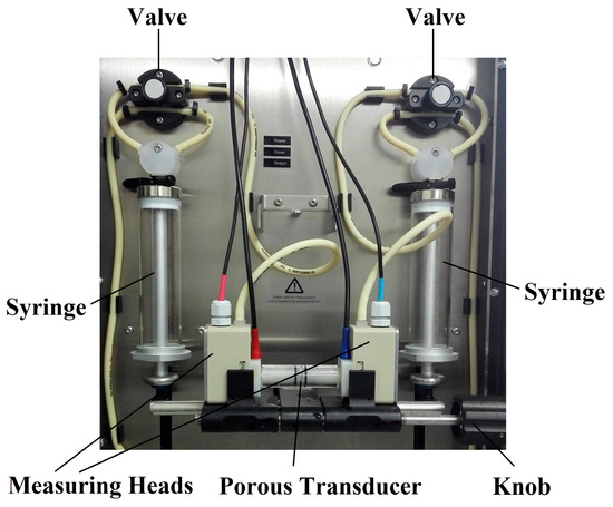 Figure 3 shows the laboratory set up for the measurement of permeability. Transducers are mounted between the two measuring heads and placed in ring made of silica gel to avoid the wall effect [31]. The flow is controlled by the valves and syringes automatically, and the differential pressure on the transducer and the flow rate are measured at the same time to calculate the permeability by Equation (13). The measuring range of the differential pressure is ±100 kPa with the precision of ±(0.2% + 50 Pa). The flow rate can reach 300 mL/min.