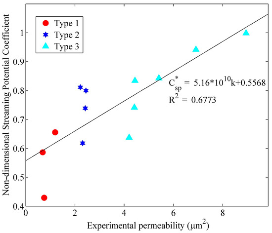 The relationship of streaming potential coupling coefficient versus experimental permeability.