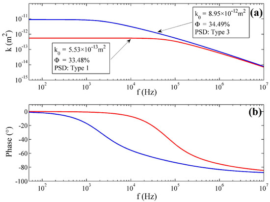 where and are the permittivity of vacuum and the relative permittivity of the fluid respectively, is the zeta potential at the fluid-solid interface, is the bulk conductivity of the fluid, denotes the surface conductance of the fluid-solid interface, is a constant parameter determined by the pore shape and is the formation factor of the porous medium, where is the bulk porosity and is the cementation exponent of the porous transducer and assumed to be for spherical packing media [27]. As a result, the dynamic characteristics of the permeability can produce marked effects on the dynamic performance of the fluidic system, as well as the electrical molecular system of the sensor. Johnson et al. [30] has proposed a model of the dynamic permeability in porous material via analysis of permeability in the complex frequency domain, as: